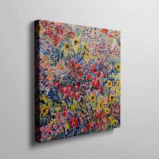 In a painting dominated by vibrant summer color, the landscape unfolds with a captivating display of chaotic forms that invite the imagination to roam freely. The landscape stretches like an endless tapestry, adorned with streaks of red, yellow and hints of blue evoking a sense of both mystery and calm. Towering floral forms rise dramatically from the earth, their jagged silhouettes bathed in deep purple shadows, while splashes of cerulean and ultramarine suggest the play of light on rugged terrain.